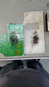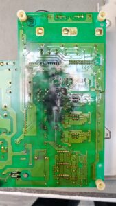 Die darüberliegende Steuerplatine zeigte deutliche Verfärbungen und Verkohlungen, besonders in den Bereichen, in denen sich die Hitze aufgestaut hatte.